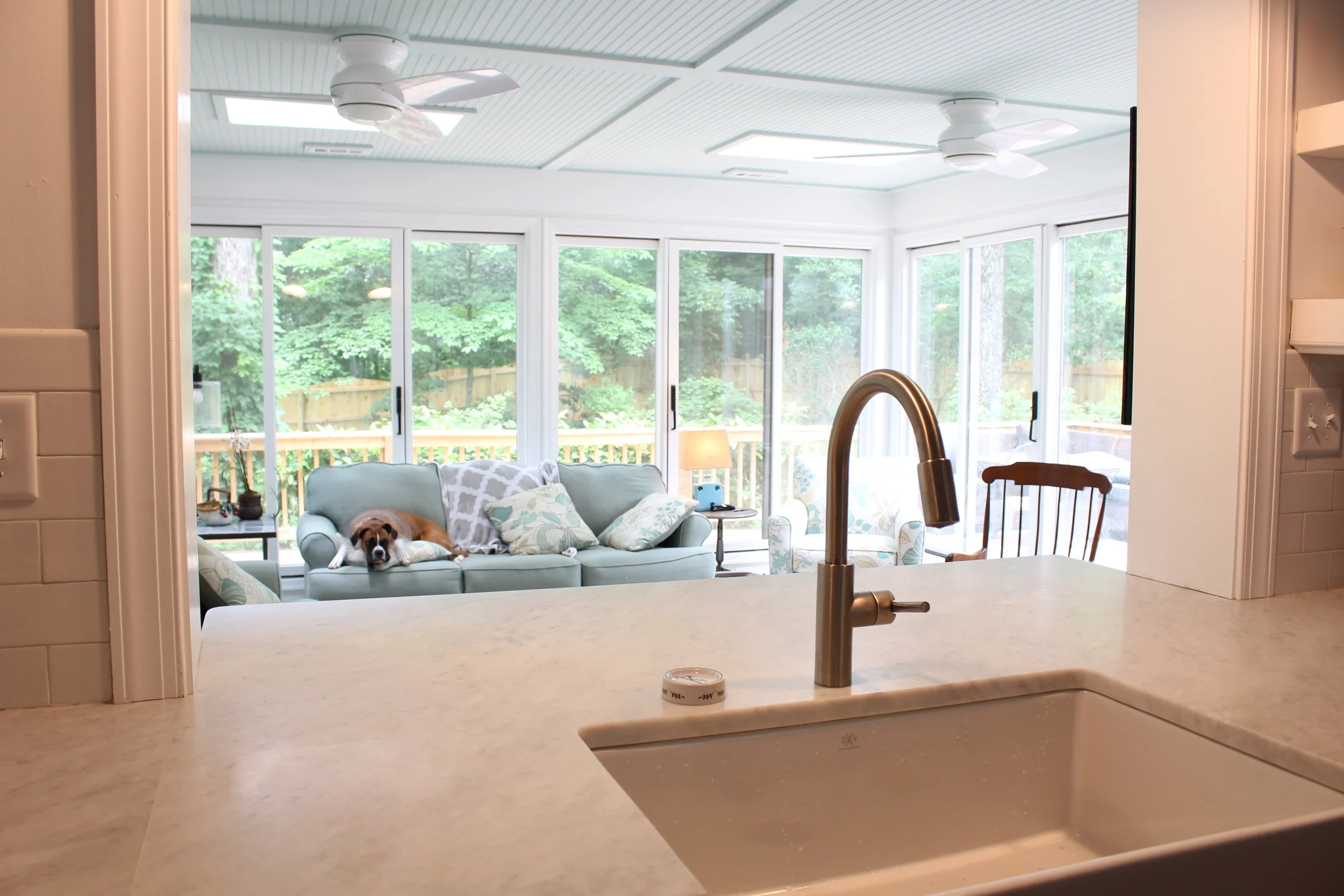 Built in 1966, this Oxford neighborhood gem received a complete remodel in 2016. The biggest layout challenge for this project was creating a proper master suite for our client in this split tri-level home. We opened up the hall bath on the second floor to the largest bedroom in the home and then created a pass-through to another bedroom which we turned into a large walk-in closet. In addition, our client spends a considerable amount of time in the sunroom. By opening up a pass-through above the kitchen sink, we were able to draw in more natural sunlight into the darkest part of her home and create a better connection between the sunroom and the kitchen. Lastly, we opened up the tiny kitchen to the tiny dining room and bowling alley living room creating a wonderfully spacious great room, the perfect solution for our hostess-with-the-mostest client.